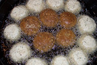 Cu manile umezite in apa rece formam chiftelutele la marimea dorita . In timpul acesta punem uleiul la incins ( uleiul sa fie din abundenta) si cand este fierbinte punem chiftelutele la prajit (putem face proba daca uleiul e fierbinte presarand un praf de faina ,cat luam intre doua degete , iar daca uleiul sfaraie inseamna ca putem aseza si chiftelutele0. Focul il vom da la economic ( flacara mica) si vom praji chiftelele pana vom oserva ca devin frumos aurii pana la mijloc. In acest moment le vom intoarce si continuam tot la foc mic coacerea lor. Le scoatem pe srvet de hartie ce va absorbi surplusul de ulei si le putem servi ori alaturi de fasole batuta (sau frecata , facaluita ...) sau cu ketchup, mustar, hrean.....